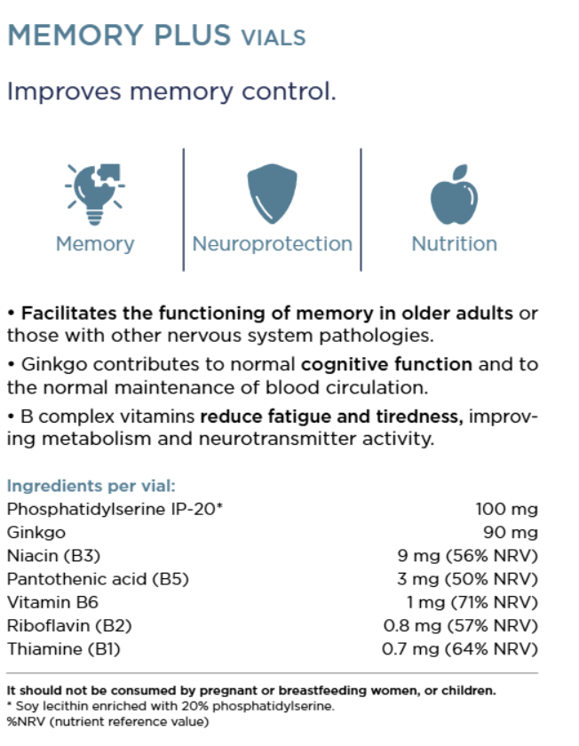 Memory Plus Ampuller är särskilt intressanta för äldre vuxna som vill bidra till normal funktion i nervsystemet och kognitiv funktion (t.ex. minne), samt balansera hjärnans och energimetabolismen.
