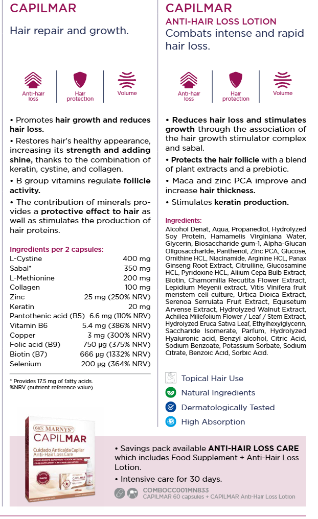 CAPILMAR är ett kosttillskott i kapselform som djupt näringstillför hårrötterna och främjar hårreparation tack vare egenskaperna hos sina ingredienser: sabal, marint kollagen, cystein, biotin och essentiella mineraler.