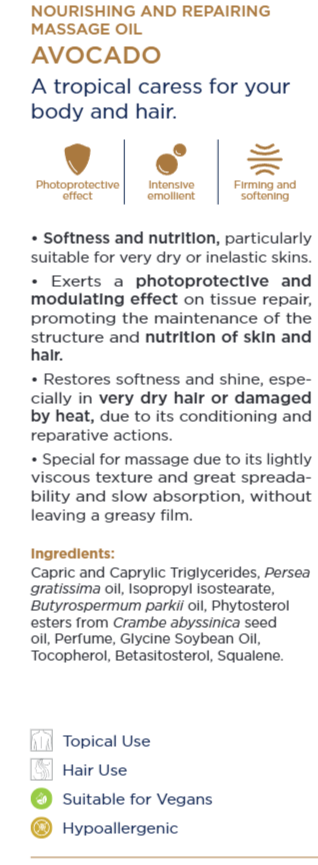Närande och reparerande massageolja med avokado är formulerad med 100 % botaniska oljor: avokado, crambe, sheasmör och växtsteroler som intensivt återfuktar, mjukgör och stärker huden.