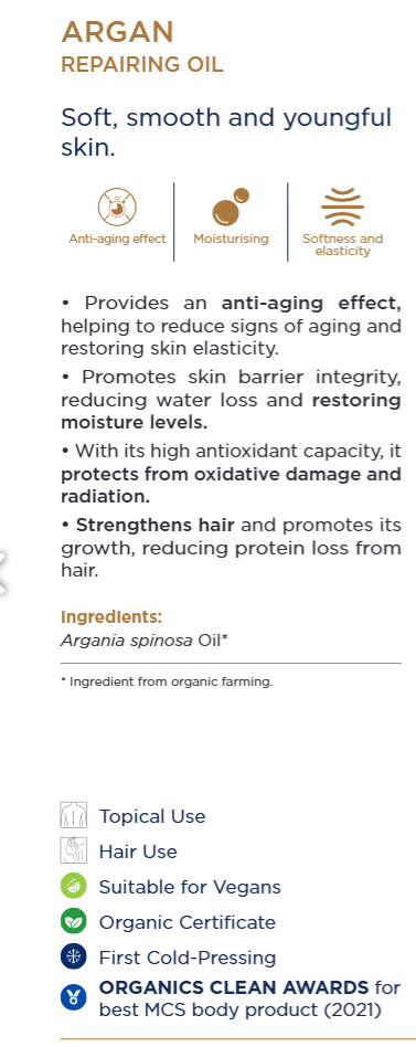 Ekologisk arganolja är en 100 % ren, kallpressad vegetabilisk olja med lätt och silkeslen konsistens som snabbt absorberas av huden utan att lämna en fet hinna. Oljan utvinns ur kärnorna från arganträdets frukter (Argania spinosa) i sydöstra Marocko.