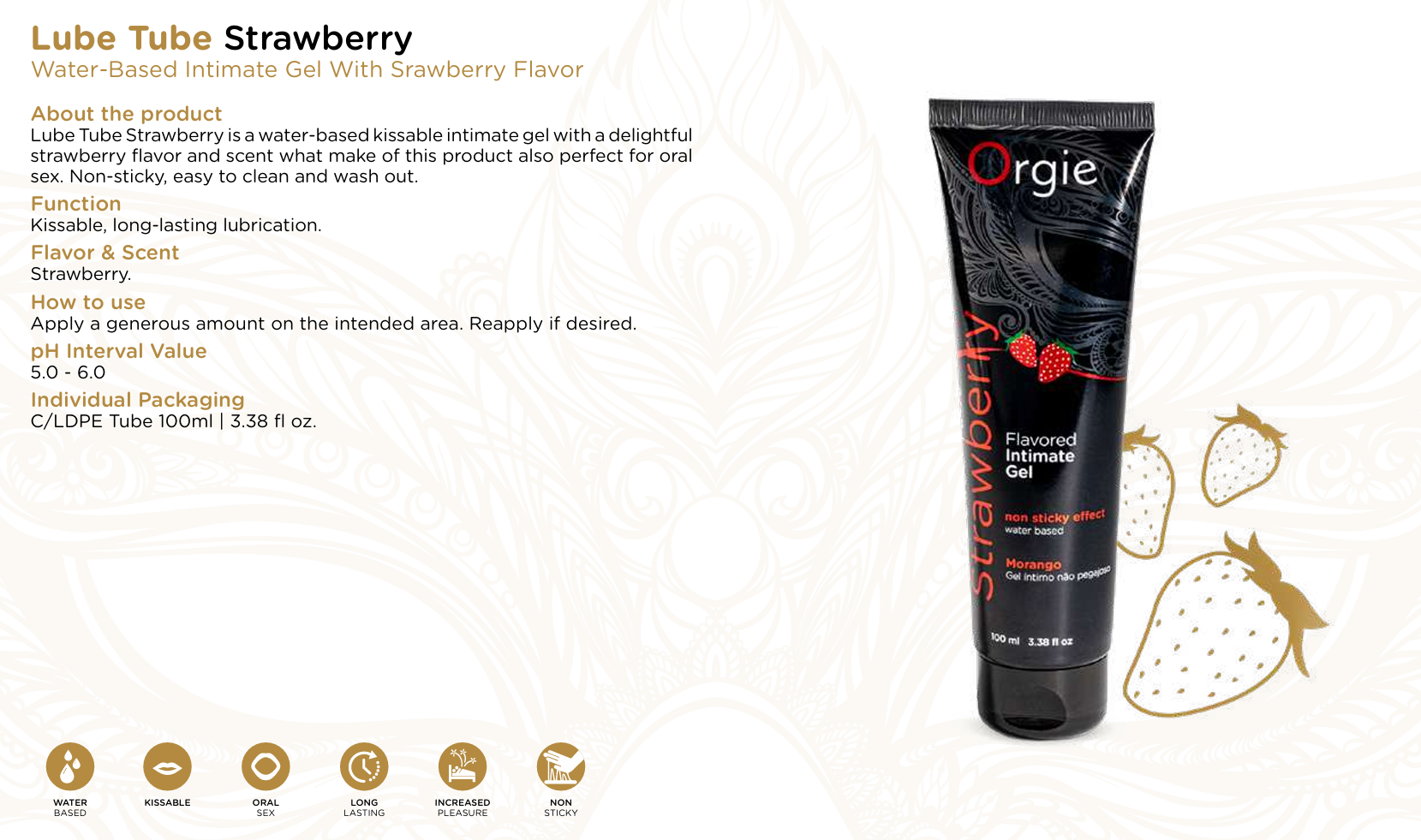 Lube Tube Strawberry är ett kyssvänligt vattenbaserat intimgel med en härlig smak och doft av jordgubb, vilket gör produkten perfekt även för oralsex. Den är långvarig, klibbfri, lätt att tvätta bort och rengöra.