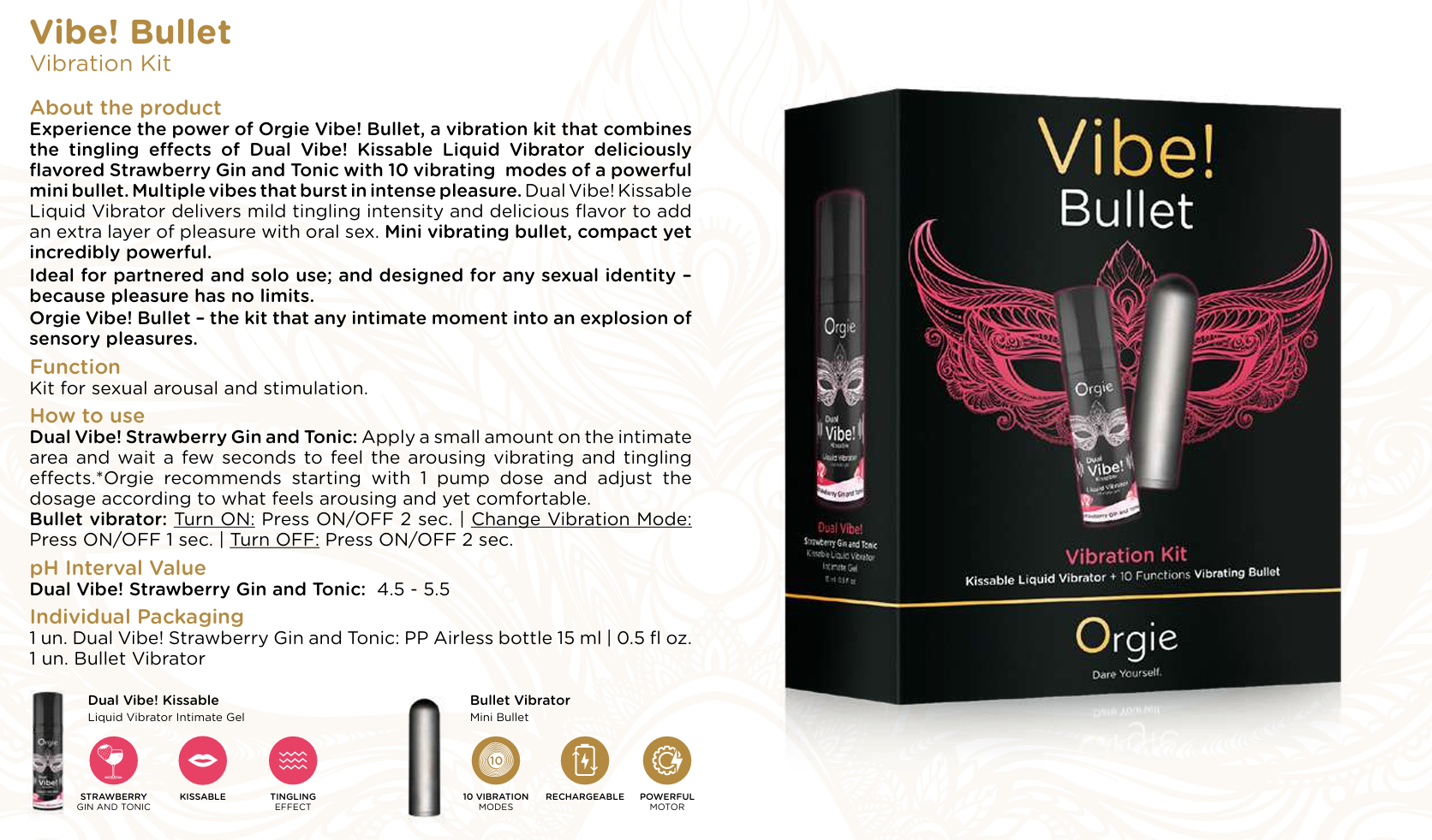 Upplev kraften i Orgie Vibe! Bullet – ett komplett njutningskit som kombinerar den pirrande effekten av Dual Vibe! Kissable Liquid Vibrator (med oemotståndlig smak av Jordgubb och Gin Tonic) och en kraftfull mini bullet-vibrator med 10 olika vibrationslägen. En explosion av intensiva känslor och flerdimensionell njutning – perfekt för både par och soloanvändning.